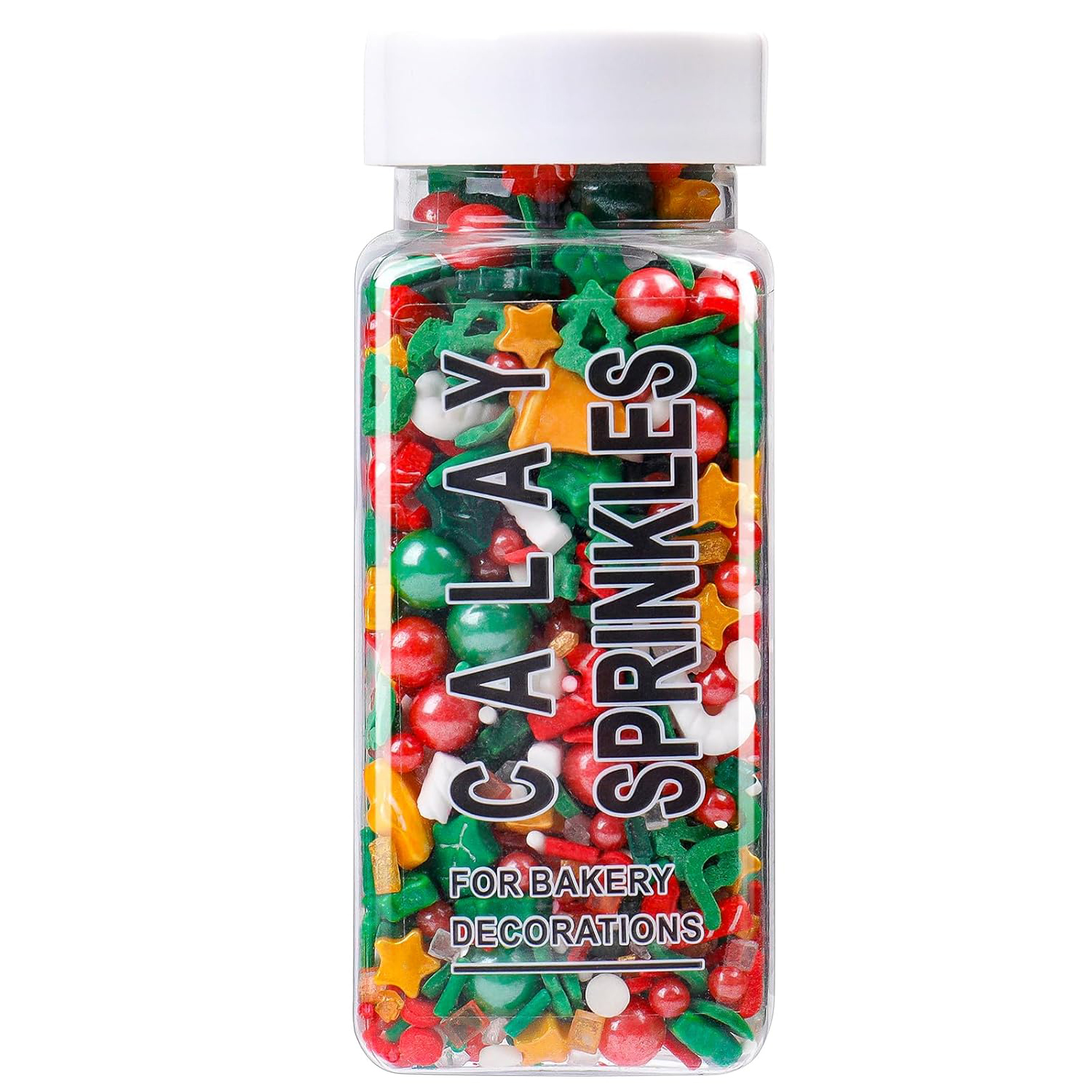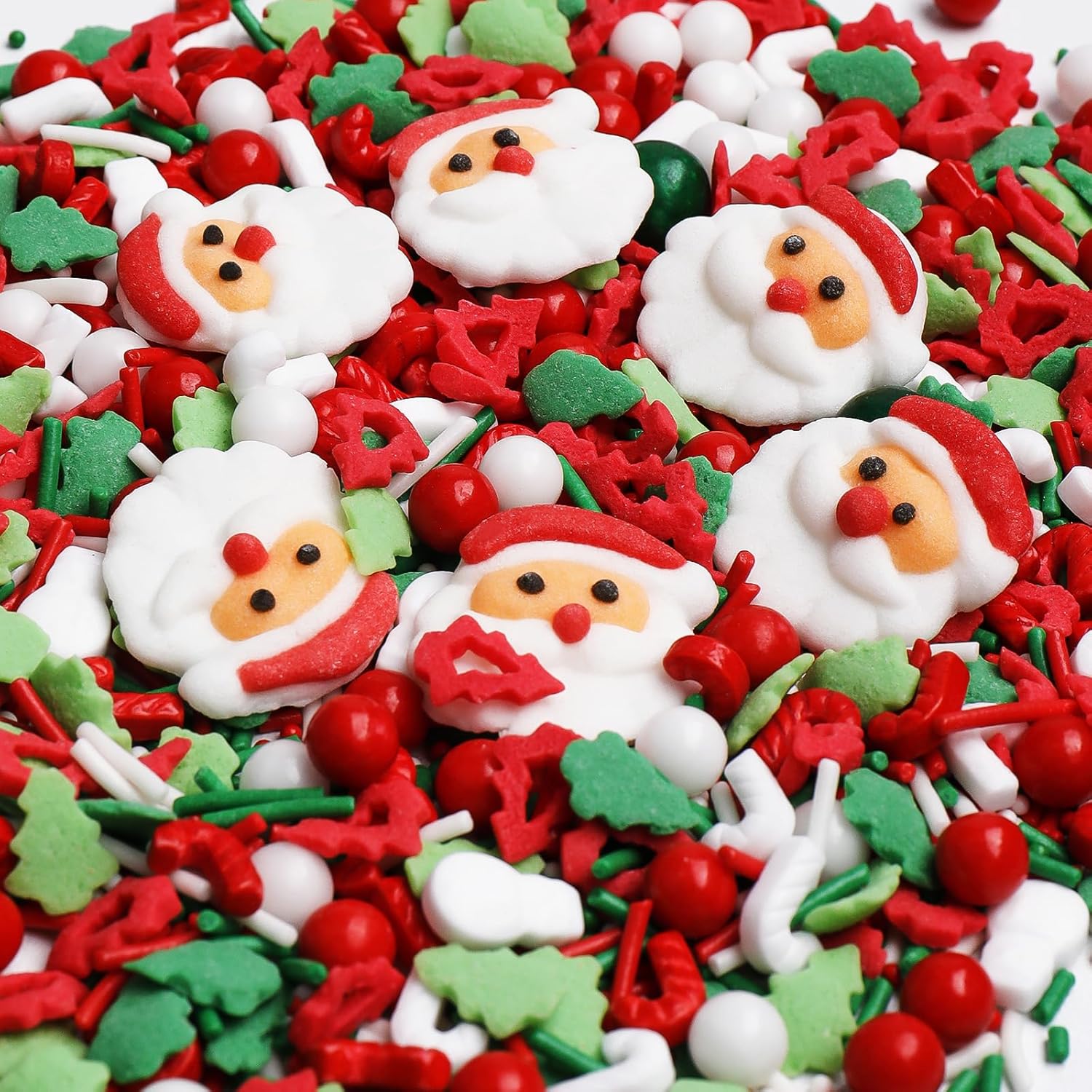 1.Festive Christmas Mix & Colors: Features a delightful blend of classic holiday shapes including Candy Canes, Santa Claus, Snowmen, Christmas Trees, Jimmies, and Pearls. The traditional red, white, and green color scheme instantly brings Christmas cheer to any dessert.